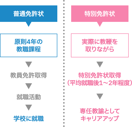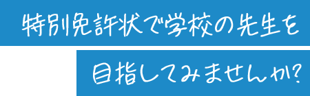 通常の教職課程を経ずに取得できる教員免許です。教員免許を持たない、優れた知識・経験等を有する社会人が、学校教育に参画しやすくする制度として創設されました。授与された都道府県内であれば、普通免許状と同等に扱われ、有効期限も無期限です。なお、取得には勤務する学校からの推薦(内定)が必要となります。